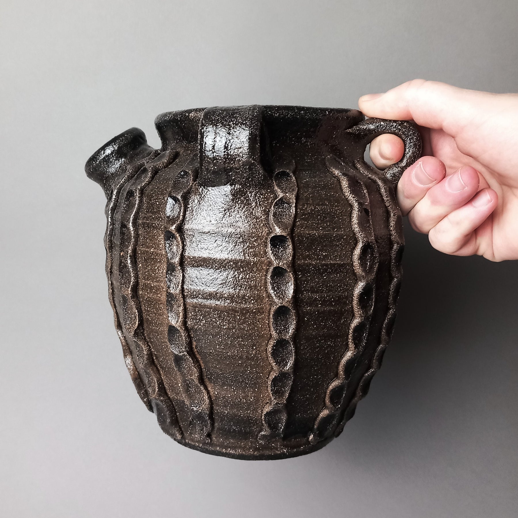 The distinctive ribbed decoration on this piece is created by applying strips of clay to the pot’s surface and then pressing dimples with the fingers. This museum-quality replica has been finished with a black glaze, a rare and high-status feature at the time, as most pitchers of this period would have remained unglazed.