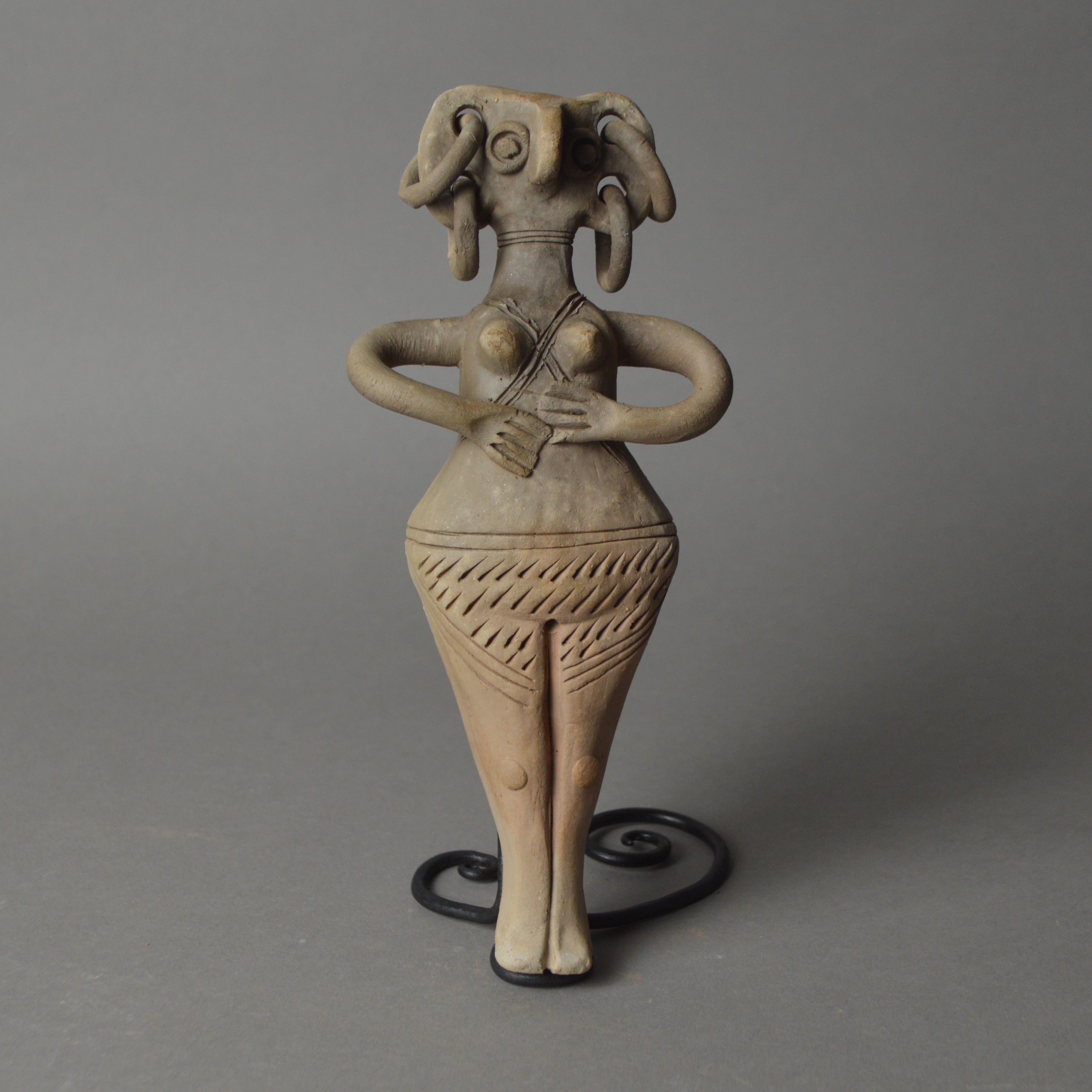 Similar painted figures appear in hunting scenes on Naqada II pottery, suggesting a connection between women and early ritual practices—especially those linked to animal sacrifice and hunting traditions. When depicted with arms raised like the horns of a bull, these figures are thought to be invoking power in a sacred ceremony.