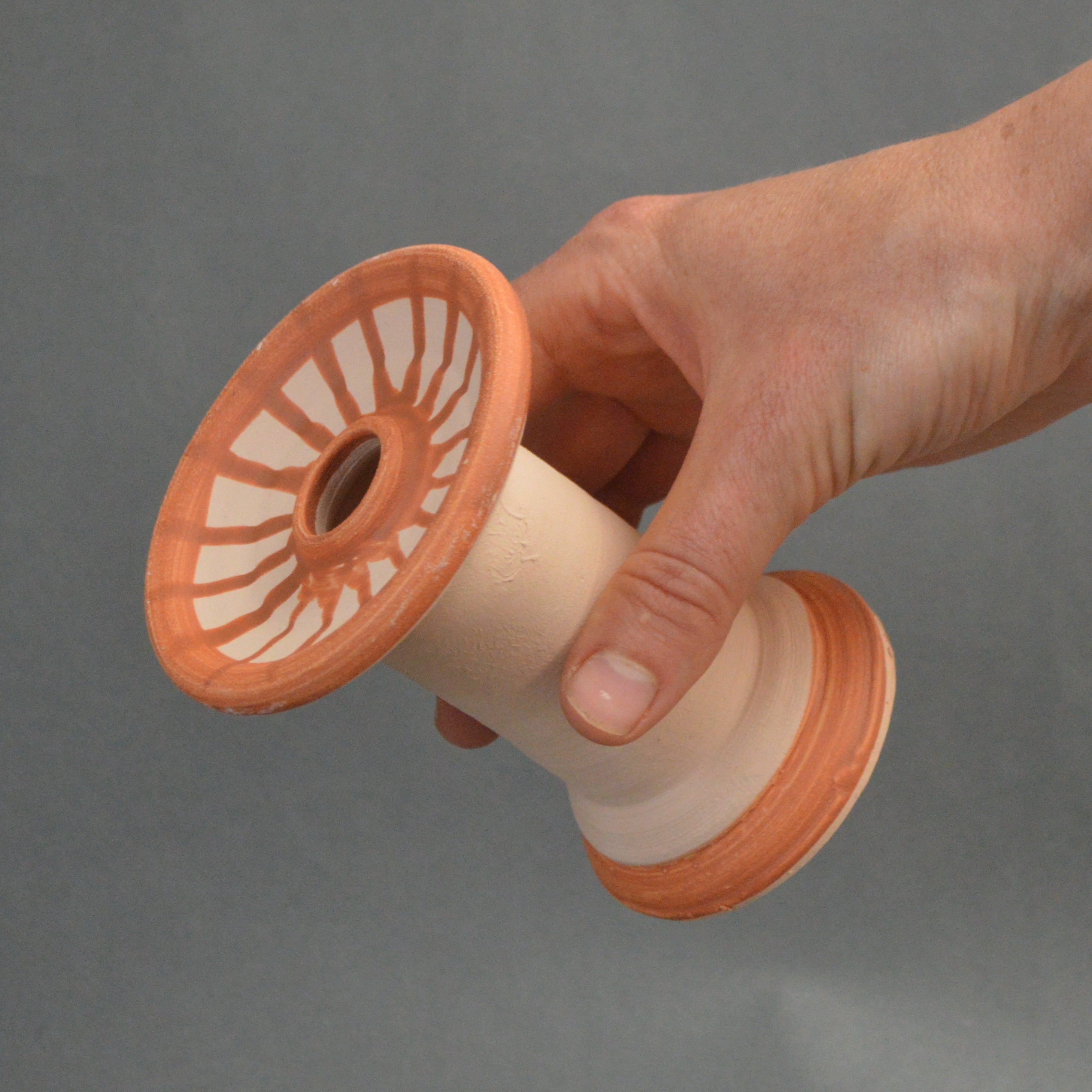 This replica candlestick has been handmade in Northumberland by Potted History, using techniques and tools inspired by those of Roman potters. Each piece is formed from natural clay, fired traditionally, and finished by hand to echo the colour, form, and texture of the originals.
