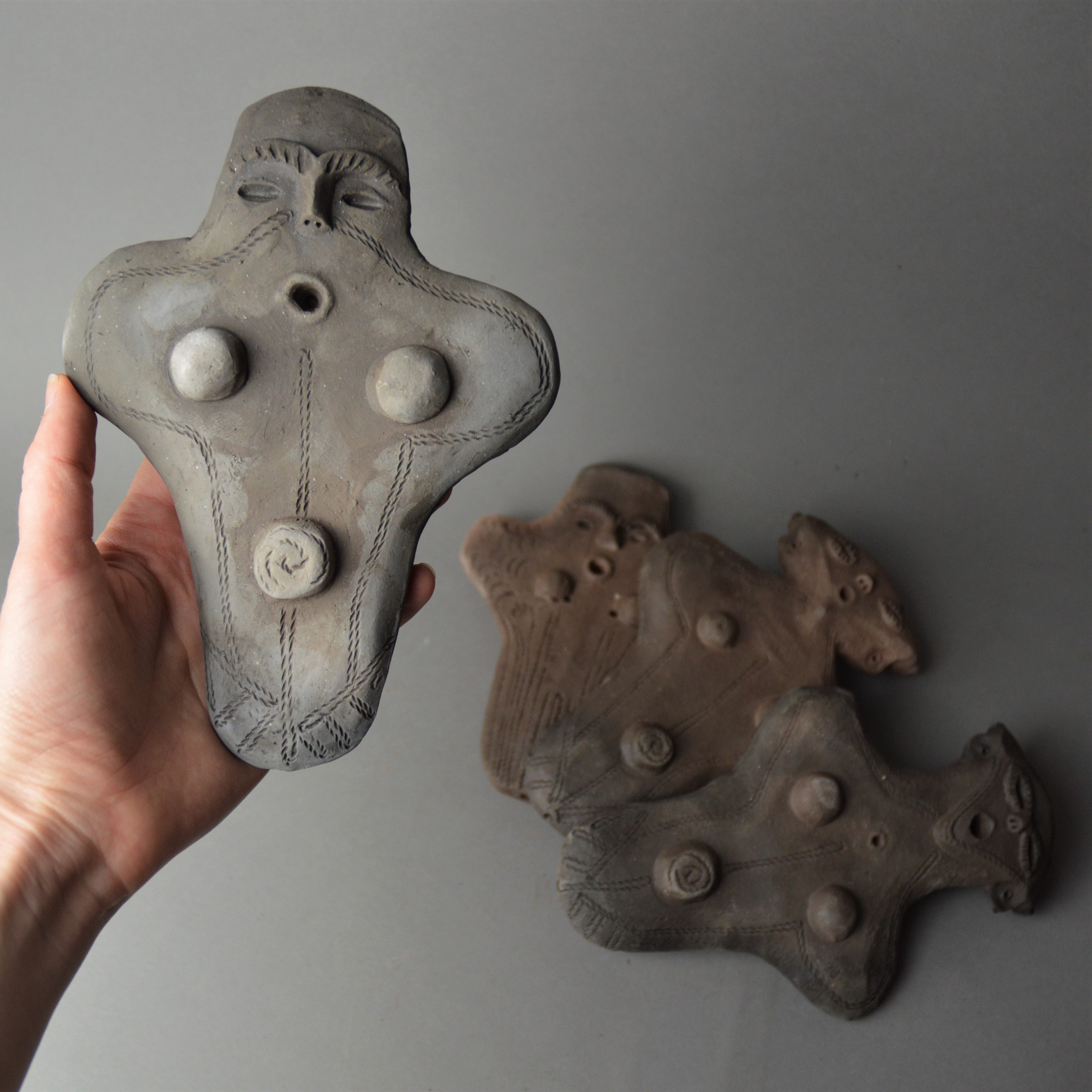 Due to the fragmentary nature of cruciform Dogu, we have not always had the luxury of a full figure when recreating these figures. We have therefore worked with several Dogu examples from the middle Jomon (2500BC-1500BC) period to reimagine what they may have looked like including examples from Sannai Maruyama, Isedotai and Oyu stone circles.