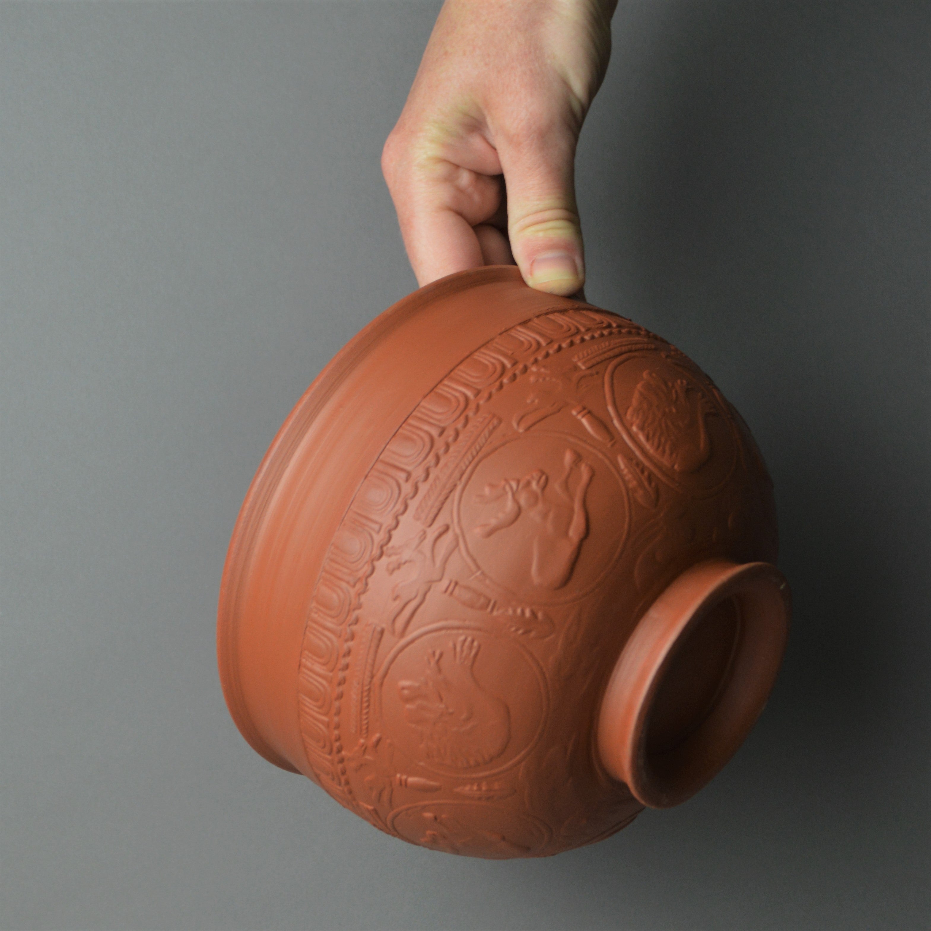 The process of recreating this highly decorated Samian Ware bowl began with the meticulous hand-carving of punches, matching the exact designs and dimensions used by ancient Roman mould makers. These fine terracotta punches, once fired, were used to impress the intricate design into the interior of a bowl mould.