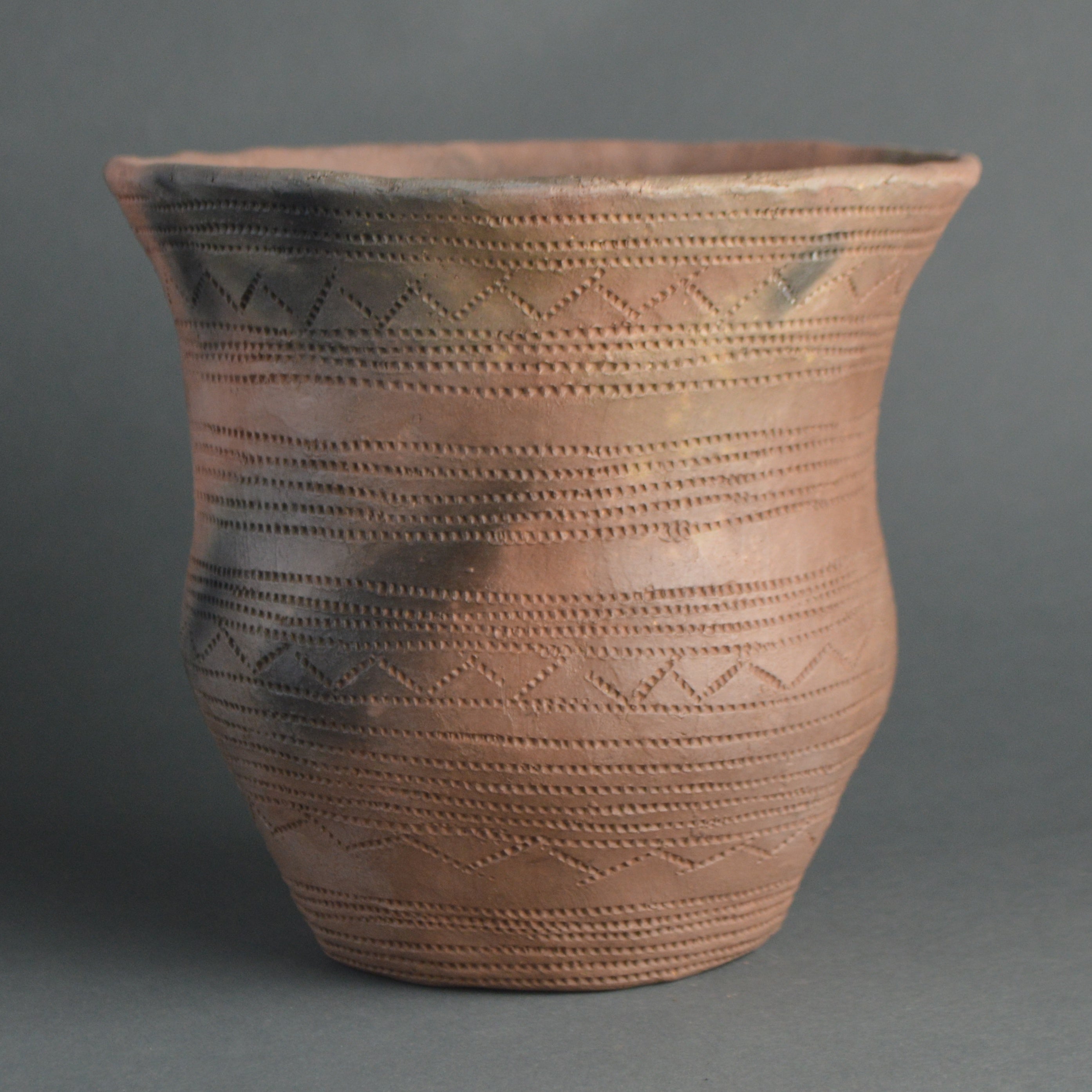 To achieve an authentic appearance, this pot has been wood-fired, replicating the ancient open-firing process used by Neolithic potters.